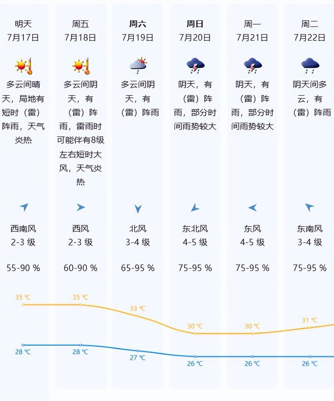 具体预报预计17-18日我市多云间晴天,局地有短时(雷)阵雨,天气炎热;19日起,海上热带系统趋于活跃,我市天气不稳定,降雨增多。